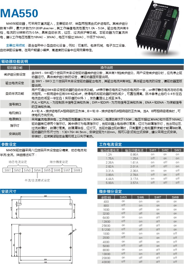 MA550驱动器,可采用交直流输入,主要驱动57、86型两相混合式步进电机。其微步细分数有16种,最大步数为51200Pulse/rev;其工作峰值电流范围为1.0A-5.0A,输出电流共有8档,电流的分辨率约为0.5A;具有自动半流,过压、过流保护等功能。本驱动器为交直流供电,建议工作电压范围为18VAC-30VAC,电压不超过36VAC,不低于16VAC。