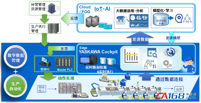的理念,是以安川的产品为核心的自动化解决方案。以此为基础,活用机器设备运转后产生的数据来提高生产效率,确保和维持生产品质。并且在软件界面上将采集到的数据进行演示分析,以此来实现整个生产线的不间断运行。