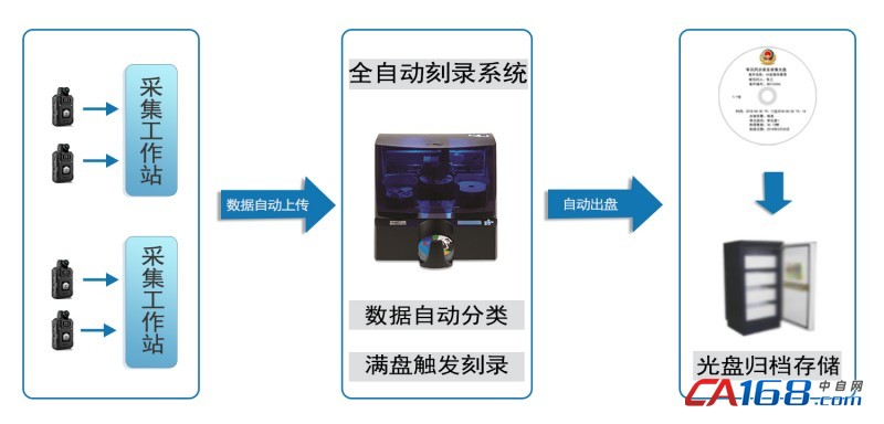 执法记录仪数据自动备份光盘刻录系统内置多个刻录机,实现全自动批量刻录CD/DVD/BD不同类型的光盘。并提供多种全自动触发刻录模式和友好的中文软件操作界面,可实时监控视频文件大小。盘满后,可自动换盘,达到无人值守,大大提高工作效率。