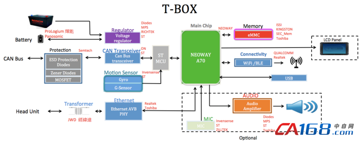 Telematics BOX,简称车载T-BOX,车联网系统包含四部分,主机、车载T-BOX、手机APP及后台系统。主机主要用于的影音娱乐,以及车辆资讯显示;车载T-BOX主要用于和后台系统/手机APP通信,实现手机APP的车辆资讯显示与控制。