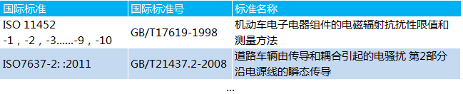 各汽车厂家对汽车电子产品的电磁兼容测试均较为严格,但其测试规范不尽相同,重点测试项目有:辐射发射、传导发射、抗干扰、瞬态干扰、静电放电。部分标准如下:
