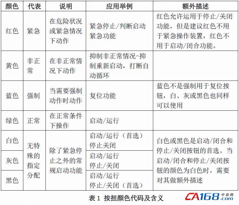 从标准中我们可以看到小小的按钮,不同的颜色,不同的含义,颜色作为一种安全信息语言有着不可低估的作用,我们也应该地使用这一无声的语言,来引起人们对不安全因素的注意,有效地减少或避免事故的发生。