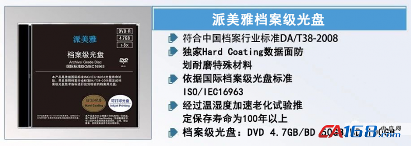 派美雅4.7G、50G、100G(DVD/BD)档案级光盘符合ISO/IEC16963、DA/T38-2008《电子文件归档光盘技术要求和应用规范》档案规定标准。从开发、设计到生产全部在最严格的管理体制下进行,而且经过耐久性测试、推定归档保存年限高达为100年以上。