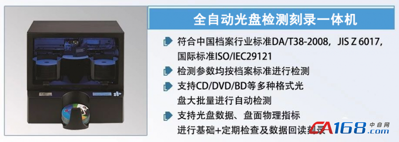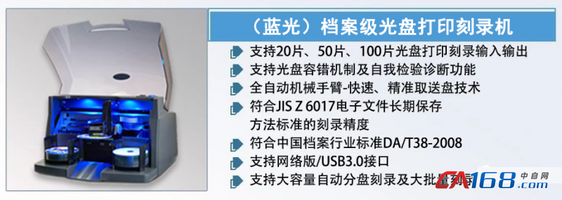 档案用户可根据自身需求选择20片、50片、100片不同光盘容量的档案级光盘打印刻录机,支持CD/DVD /BD蓝光,这款是为档案部门刻录量大的用户而开发的产品。不仅符合JIS Z 6017、DA/T38-2008中国档案行业标准。而且搭配档案级光盘一块使用,激光功率等各项参数自动调整到状态达到最佳刻录效果,达到真正意义上的电子文件归档标准。
