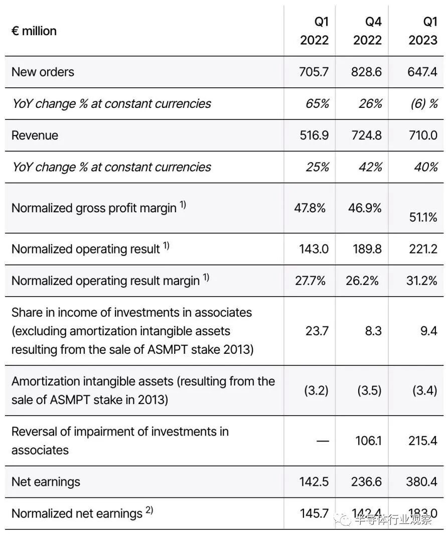 ASM International NV(ASM)第一季度也取得了良好的业绩,收入增长40%,达到7.1亿欧元。ASM总裁兼首席执行官 Benjamin Loh 表示。“由于一些系统应客户要求在第一季度而不是第二季度交付,并且在第四季度末大量订单积压的支持下,收入超过了之前660-7 亿欧元的指导。由于异常强劲的产品组合,毛利率增至 51%。第一季度订单为6.47亿欧元,仍处于健康水平,但按固定汇率计算同比下降 6%,反映出本季度末市场状况趋于疲软。我们预计第二季度营收将达到6.5亿至6.9亿欧元。但继上半年的预期增长之后,下半年的销售额将比上半年下降10%或更多。
