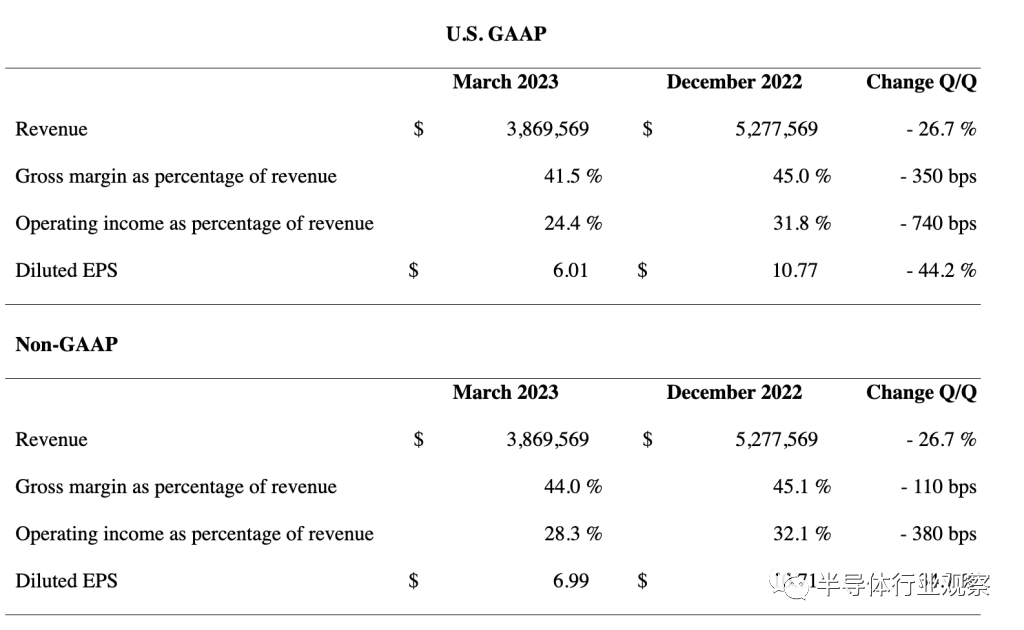 Lam Research主要生产半导体沉积、蚀刻和清洁等设备。Lam在截至2023年3月26日的季度取得了稳健的业绩,包括创纪录的代工相关收入,其内存安装基数与上一个下降周期相比增长了近 40%。该季度收入为38.7亿美元,相比于上一季度环比下降26.7%。毛利率为16.06 亿美元,占收入的 41.5%,营业费用为6.63 亿美元,营业收入占收入的 24.4%,净收入为 8.14亿美元。
