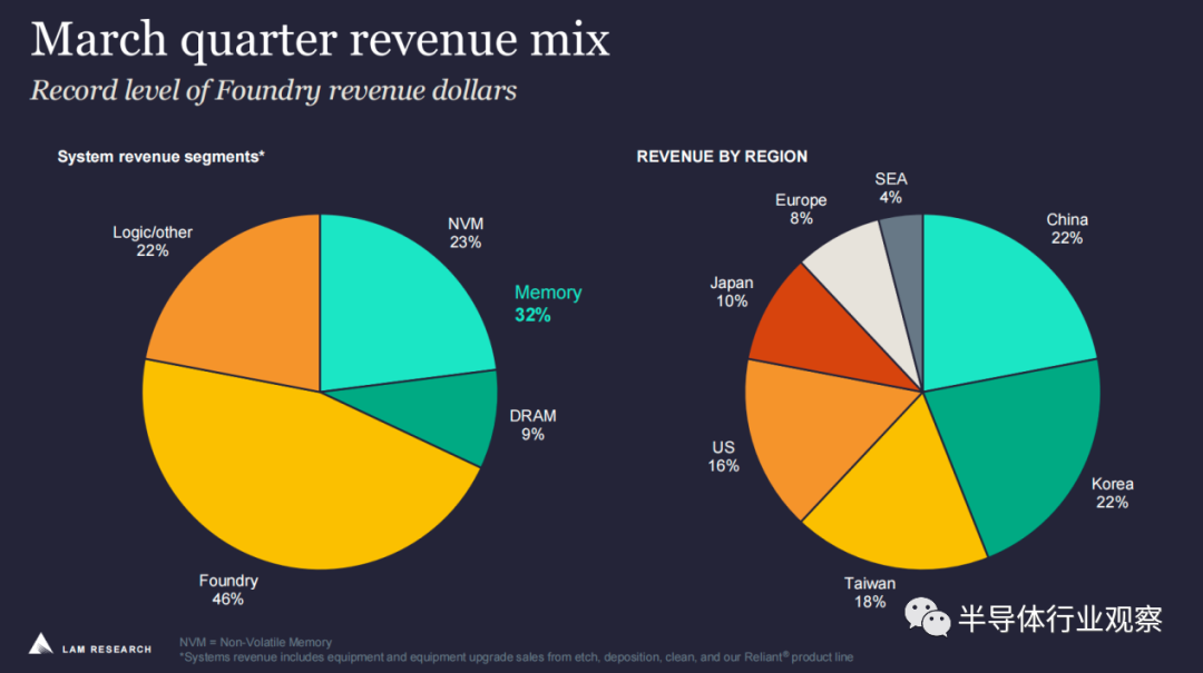 本季度收入下降的部分原因是其内存客户降低了晶圆厂利用率,减缓了技术转换,并减少了对产能增加的投资以限制位输出并使他们自己的库存正常化。从地区来看,来自中国和韩国的收入均占22%,台湾18%,美国16%,日本10%,欧洲8%。由于需求下降,Lam Research关闭了其在美国俄勒冈州的两个站点,据《硅谷商业杂志》报道称,Lam通常每年关闭两周,但本月增加了第三周。