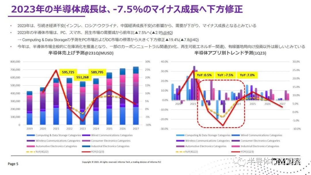 OMDIA 咨询总监 Kazuhiro Sugiyama 表示,半导体市场销售额今年预计同比下降7.5%至5512.68亿美元。“通货膨胀、俄罗斯入侵乌克兰、中美冲突影响导致经济不稳定,以及半导体库存消耗导致需求下降。负增长将持续到通货膨胀消退。它可能会从 2023 年底持续到 2024 年 3 月左右。老实说,2023 年将是耐心的一年。”Kazuhiro Sugiyama接着说。