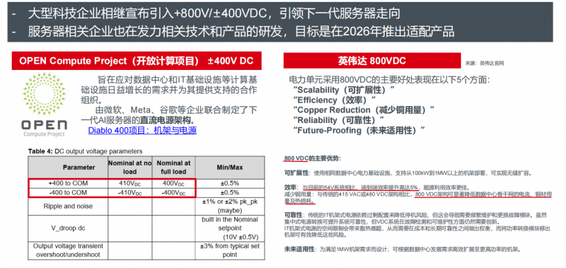 以HVDC(800伏)为例,AI服务器从电网配电到框架,框架分电源单元和IT单元,中间有备用单元如BBU、CBU,当前母线电压为48伏到54伏系统。下一代AI高压系统中,电网基本不变,电源改变,备份单元置于电源内,母线电压升至HVDC(正负400伏、800伏甚至1500伏)。