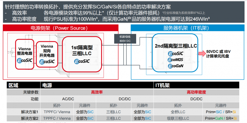 以IT机架电源解决方案为例,一次侧应用碳化硅1200伏产品,封装有贴片和插件两种,导通电阻低。如Ruby机型效率达98%及以上,用碳化硅可冲击99%效率。二次侧DC/DC为低压产品,要求开关损耗小、导通电阻低,罗姆开发的产品使功率密度达129W/in³。针对更高功率密度需求,氮化镓可应用于高频场景,如从100千赫兹提升到500千赫兹,硅和碳化硅难以胜任,氮化镓可使元器件及外围电感电容变小,功率密度提升至246W/in³。