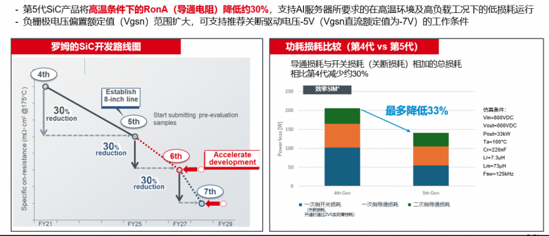 在AI服务器中,电源侧和服务器侧对产品要求不同。电源侧主要用硅或碳化硅产品,罗姆可提供全系列碳化硅产品;服务器侧DC/DC分为一次侧和二次侧,一次侧罗姆提供碳化硅和氮化镓产品,二次侧提供多种硅产品。