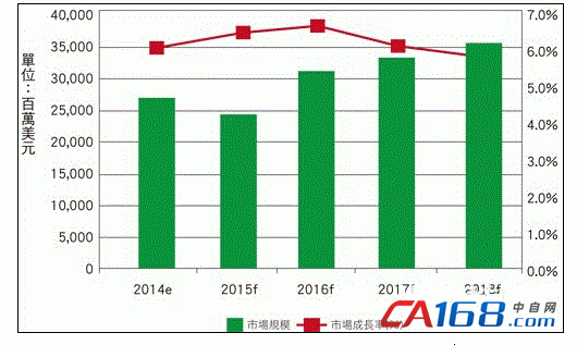 市调机构Global Industry Analysts于2013年7月发布的市场报告指出,由于2014年全球经济景气复苏,工业马达市场规模可达263亿5,000万美元,相较于2013 年,年成长率达6.1%;而预计至2018年产值将达333亿6,000万美元,每年以5?6%的年成长率稳定发展(图2)。