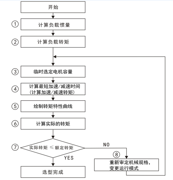 本文档以实例为基础,通过对机械系统部件构成及运行情况的计算,得出必要的电机容量参数,方便客户选择合适的伺服电机。容量选择计算,主要流程如图1所示,主要计算项目包括: