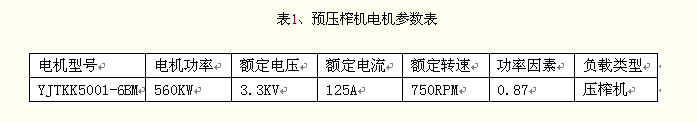 现场改造部分是预压榨机组。改造前:预压榨机组采用汽轮机带动,由于汽轮机效率低,糖分抽出率不高。所以改成异步电动机+变频器调节的方式。异步电机的详细参数见下表: