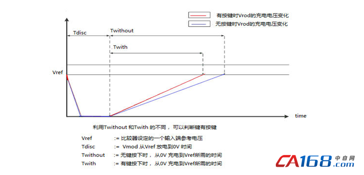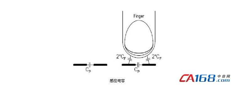 手指触摸所产生的传感器电容变化,导致传感器电容和基准电容之间的电荷转移发生变化;