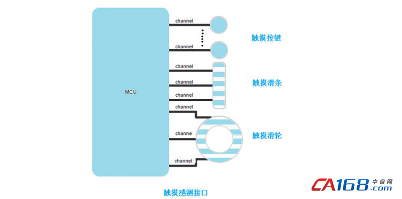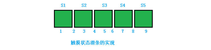 1,触摸状态滑条:把触摸按键按顺序紧密排列在一起,即可以设计成触摸滑条。当检测到传感器通道处于开启状态时,就能确定手指在触摸滑条的哪个位置了。如图