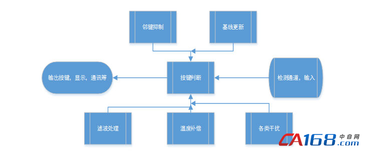 电容按键组的常见形式为:一组电容中每个电容的一侧都接地。这样,工作电容只有一侧可存取;按键是接地的可变电容。手指的存在加大了按键接地的电容,决定按键是否激活取决于电容测量是否发生了改变。