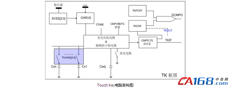 如下图(TouchKey电路架构图)中TKAINS[3:0]的2个开关与感应电容Cxn构成了开关电容,采样电容即为Cadj。由于PCB的layout差异,每个触摸按键构成的开关电容可能不相同,即感应电容不相同,因此,单独通道可设才能有效的解决整体的灵敏度一致性。这也是该算法的特性之一。
