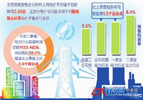 根据中经电力产业景气指数监测,今年二季度,经初步季节调整,电力行业实现利润总额1133.4亿元,同比增长28.2%,增速比上季度上升2.6个百分点,连续2个季度保持上行。经测算,电力行业销售利润率为8.4%,比上季度提高1.5个百分点,比去年同期提高1.5个百分点,是近几年来的最高水平,明显高于全部工业销售利润率5.5%的平均水平。