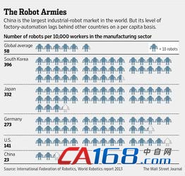 由于这种劳动密集型,低利润的装配工作在中国依然如火如荼地进行,所以中国在人均自动化方面远远落后于邻国韩国和日本。而那些国家恰好是先进电子元器件的主要供应商——诸如记忆芯片和液晶显示屏——稳定的设计和更高的利润空间也给它们的自动化提供了条件。根据国际机器人协会得到的数据,韩国和日本在制造业领域每10000人就拥有超过300个多用机器人。而中国每10000人才对应23个机器人,低于世界平均水平的一半,即使中国工业机器人的总供给量从2008年到去年都以每年36%的速度增长。