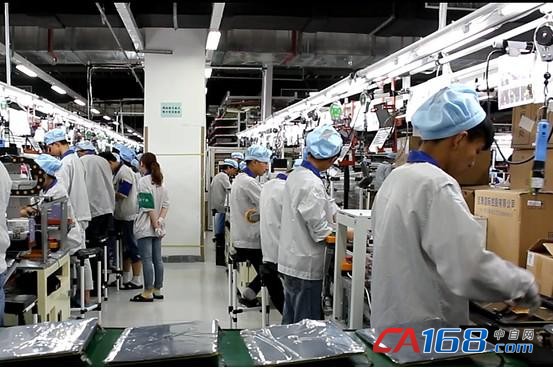 在和硕重庆工厂的第四层生产车间里,少量的工人在监控计算机电路板的生产。崭新发亮的蓝色电板一排排从传送带进入白色机器中,伴随着嵌入芯片还是其他什么零件的“嗒嗒”声。加工完毕的电板从机器另一端的尽头显现出来,在这个过程中基本上都没有人碰过它们一下。