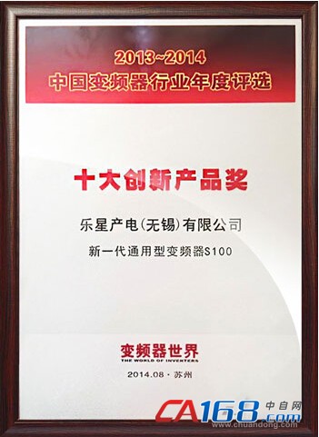 2014年8月,LS产电S100变频器荣获由《变频器世界》杂志评选的,“2013-2014年度中国变频行业十大创新产品奖”。S100系列是LS产电近期推出的新一代高性能通用型变频器,该系列变频器性能优异、品质可靠、功能强大,具有超高性价比,是中国各工业领域行业客户的最佳选择!