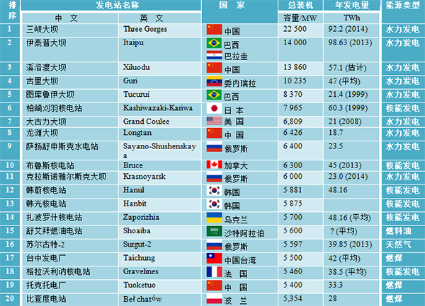 世界上最大的电站是水力发电站,其次是核电站;燃煤和燃气电站元不如水力发电。中国水力发电在电力供应中最为突出,居世界领先地位。水力发电和核能发电均属清洁能源发电,而天然气和煤等化石燃料发电,属于火力发电。