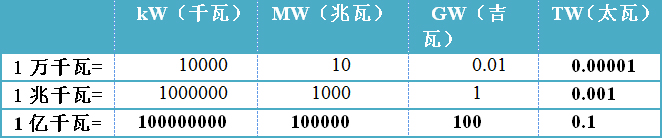 单位换算特别注意,中国常用电力单位常用中文表示,英文只有“十亿(billion)”,而没有“亿”的英文词,因此,两者的换算如下表。