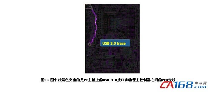 在选择与笔记本电脑一起使用的USB3.0电缆时,也有一些因素需要考虑。大多数USB3.0相机厂商提供的电缆长度为5米。然而,这些较长的电缆通常是在PC机上测试的,而PC上使用的是PCI-Express主控制器卡。在PCIe卡上,物理USB3.0主控制器芯片和USB3.0接口紧靠在一起,因此印刷电路板(PCB)的“走线”非常短(见图3)。然而在笔记本电脑上,其主板电路设计比较紧凑,PCB走线可能会很长。在这种情况下,USB3.0电缆的长度加上PCB走线的长度,可能会导致电缆连接距离太长,并且会出现连接不稳定的现象。因此在这种情况下,最好使用较短的电缆,或者购买适合工业应用的更高质量的电缆。请参阅下一节中有关“为USB 3.0延长电缆长度”的更多信息。