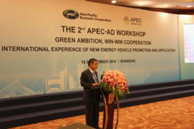 APEC2014年汽车对话会议主席、工业和信息化部装备工业司司长张相木致开幕词并作主题报告。他介绍了中国新能源汽车政策体系建设、标准法规体系建设情况,以及中国新能源汽车的推广应用情况。