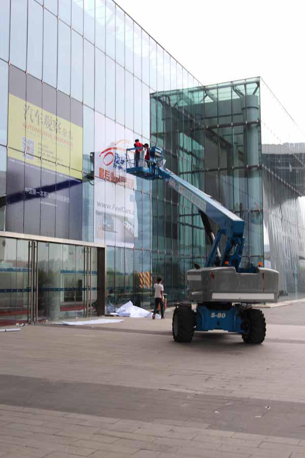 随着展商、合作方对现场广告位要求的逐步提高和组办方的精心布局、安排,现场的指引、展示牌从设计到安放都经过慎密的考虑,安装广告的工人在安全防护下展现飞檐绝壁的本领,现场广告布置已初步到位。