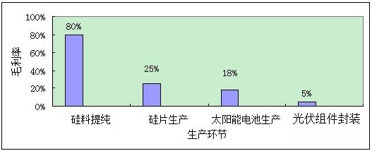 (三)光伏产业链中高附加值环节较少。光伏产业链大致可分为“硅材料提纯、硅片生产、太阳能电池生产、组件封装”四个环节,其中硅材料提纯是产业链核心技术环节,利润也最高。一般来说,硅材料提纯毛利润可达80%,硅片生产约为25%,而太阳能电池生产和光伏组件封装利润分别为18%和5%左右,整个产业链利润呈倒三角形。中国光伏企业大多处于利润低廉的光伏组件环节,市场竞争激烈;主要硅片原料都从国外进口,且超过60%的市场都在海外,光伏产业发展不均衡。