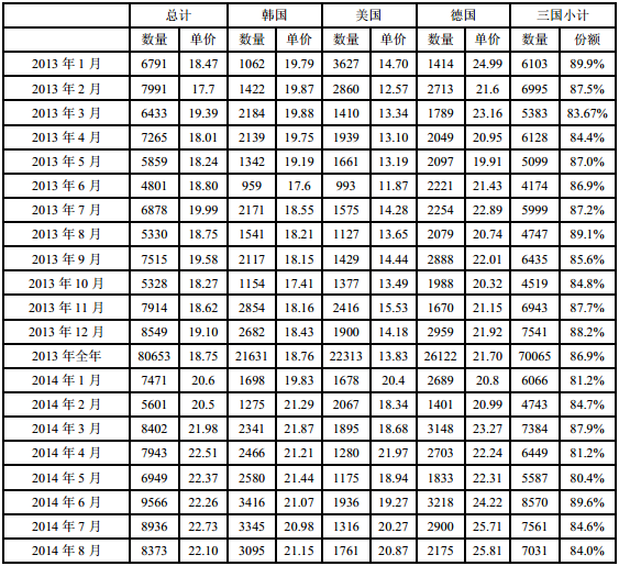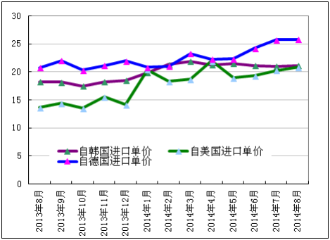 图4 2013年8月-2014年8月从韩、美、德进口多晶硅单价走势图 数据来源:海关