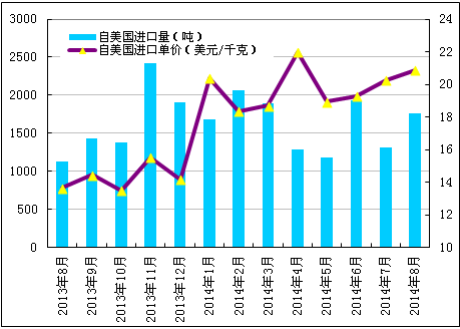 2014年8月份从美国进口多晶硅量增至1761吨,环比增幅为33.8%;进口单价继续小幅回升至20.87美元/千克,环比增幅为3%。