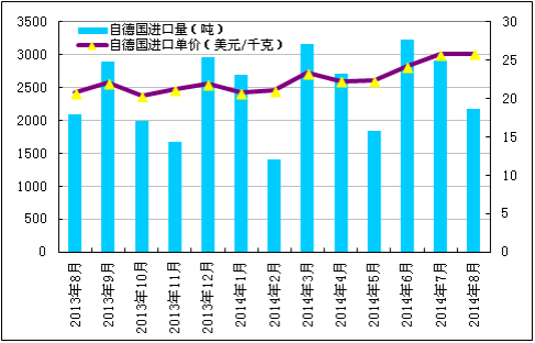 2014年8月份从德国进口多晶硅量减至2175吨,环比降幅为25%;8月进口单价小幅上涨至25.81美元/千克,环比涨幅为0.4%。