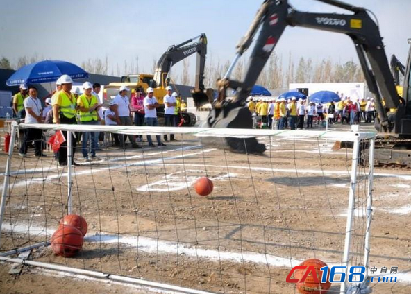 在这场比赛中,参赛者用挖掘机的“爪子”将架子上的球取下,并装入“爪子”,再将球放在球门的斜前方,摆动“爪子”将球打进球门;第二大项目是参赛者用挖掘机“爪子”上的挂钩将方铁块勾起,然后将铁块准确放入方框,完成比赛且用时最短者获胜。