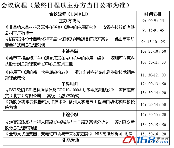 聚焦光伏逆变器、充电桩磁组件技术创新,备受行业内外人士瞩目的“第四届光伏逆变器暨汽车充电桩磁组件应用技术研讨会”前期筹备工作已经接近尾声,会议从一开始便呼声高涨,超乎主办方预料,目前已有超过500多人报名参与,同时会议也吸引了众多媒体关注,这将成为国内规模最大,层次最高的第一场针对新能源磁组件技术创新、技术共享的高端盛宴。为了方便参会人员提前做好各项工作安排,现将会议流程予以公布: