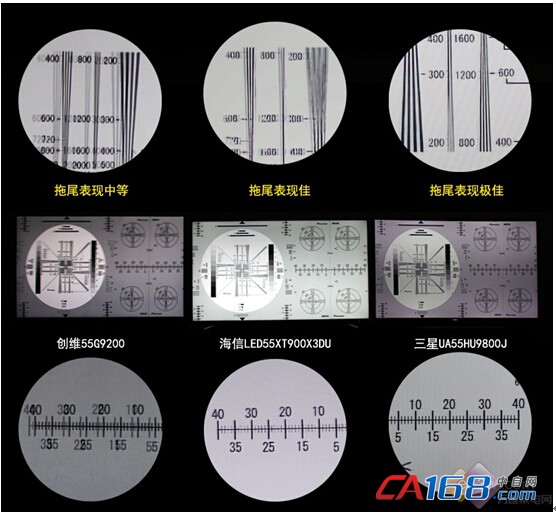 通过防抖动片源测试图可以看到,创维55G9200出现了明显的拖尾现象,线条和数字都出现了重影现象,在实际观看过程中,画面抖动几乎无法正常看清数字,而三星UA55HU9800J和海信LED55XT900X3DU表现非常不错,它们都采用了MEMC防抖技术。为了能更好抑制液晶电视拖尾问题,海信ULED还采用高达1440Hz的高速扫描系统,使得液晶在旋转过程中处于背光黑场扫描状态,降低了人眼的图像残留感,也实现了流畅运动画面。