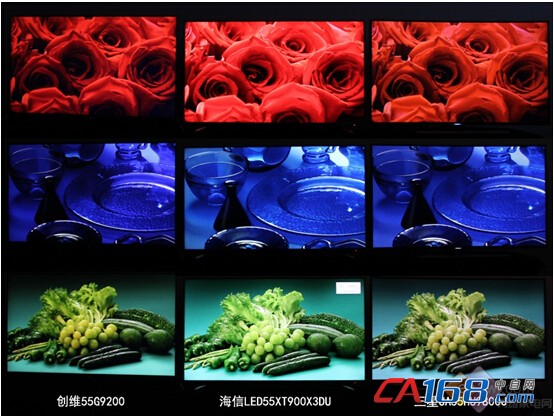 通过以上红、蓝、绿动态视频演示效果对比,可以看到三者在颜色的表现上差别很大,其中创维55G9200对于任何颜色都进行了加深处理,红的更红、绿的更绿、蓝的更蓝,像在美图秀秀当中做了“智能颜色”的处理,许多细节在无形中消失。
