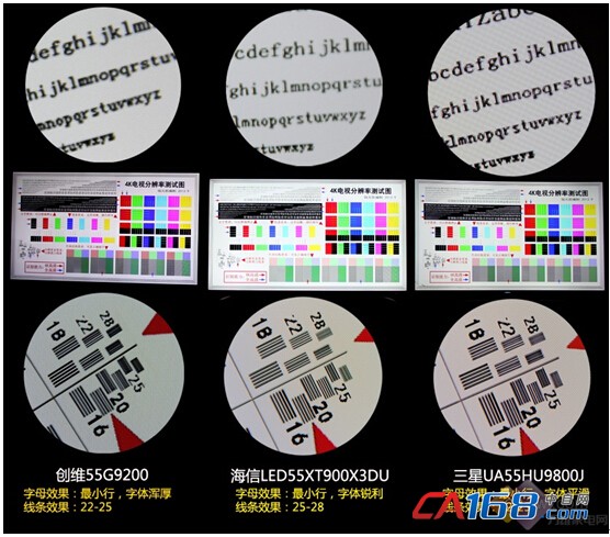 4K电视分辨率测试图是用来测试电视清晰度的专业图片,通过实际字母及数字的对比发现,创维55G9200线条颜色粗重,越小的字母越是粘连在一起,像是墨水晕染在宣纸上,这是由于4色4K电视的像素点增加了一个白色子像素点,降低了整体的像素清晰度。三星UA55HU9800J显示效果明显好于创维,海信LED55XT900X3DU的字体最为锐利,一笔一划简单直接,清晰可辨。