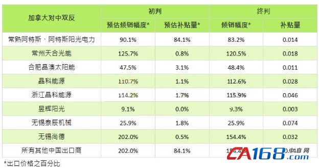 以EnegyTrend2014年统计资料来看,2014年中国对加拿大之电池片加组件约在460MW左右,其中超过八成为电池片,晶澳、茂迪中国厂、顺风为从中国出口加拿大电池片的主要厂商,三间厂商即贡献了超过300MW的电池片。EnergyTrend分析师林嫣容认为,阿特斯在当地设有组件厂、且规模已足够支应加拿大整年的产能,故中国出口加拿大之太阳能产品主要以电池片为主。本次判决虽调降了初判时预估的倾销及补贴幅度,但只要课税物件仍为组件、没有囊括电池片,就不会对加拿大进口之太阳能产品造成太大影响。最终,虽各间应诉厂商被认定之倾销幅度差距极大,实际上的获利者仅有在当地有组件产能的阿特斯。