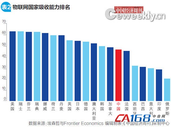 就物联网国家吸收能力而言,目前尚没有一个国家达到满分。也就是说,每个国家都具有提升空间。在国家吸收能力指数榜单中,中国位居第14位(见表2)——为了赶超美国、德国和日本,中国还需做出巨大努力。