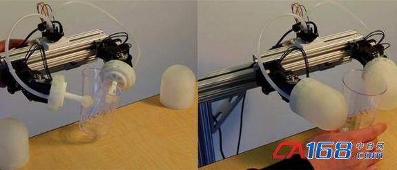 Disney Research通过一段演示视频来详细介绍了这种机器人皮肤。研究者表示,这些模块能够以一种“非常温柔”的方式与其他柔软物体进行互动。从视频当中可以看出,当没有安装该模块时,这双机械手臂直接就把一只塑料杯子给捏碎了。而装上这种柔软皮肤之后,机械手便立刻变得温柔了起来,就连拿起一块豆腐也不会对其造成任何损伤。