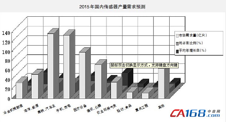 据行业统计估算,我国2014年敏感元件与传感器销售额突破1200亿元;据预测,2015年需求量可达约652.9亿只,增长率高于18%,销售额将突破1300亿元,其产业辐射和带动作用较大。目前,我国已有1700余家从事传感器研制、生产和应用的企事业单位,传感器产品达到10大类、42小类、6000多个品种。