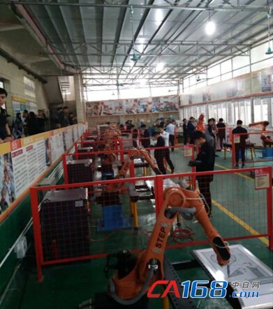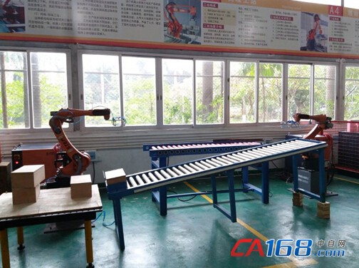 在胡宝星职业技术学校新时达机器人华南培训中心摆放着9台新时达机器人,承担了焊接、搬运、码垛、机场上下料等工序的应用。