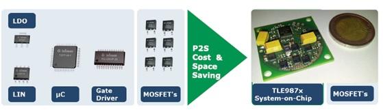 大联大品佳此次推出的车载电机控制器解决方案是基于Infineon的TLE987x和TLE986x实现的,这两个系列均采用了ARMCortexM3处理器,其外设集包含电流传感器、与捕获和比较单元(CAPCOM6)同步、可实现脉宽调制(PWM)控制的逐次逼近型10位ADC,以及16位定时器。此外还集成了LIN收发器,以便与器件及众多通用I/O通信。支持通过LIN收发器,进行快速编程。这两个系列产品均具备片上线性稳压器,可为外接负载供电。它们的闪存容量从36kB到128kB不等。工作电压输入范围为5.4V至28V。集成式电荷泵可实现低压运行和可编程电流,以及已获得专利的电流斜率控制,可为各种类型的MOSFET提供优化EMC性能,而这仅需使用两个外接电容器。这样一来,比之常见自举升压技术,大大节省了物料成本。TLE987x和TLE986x都能承受最高40V的负载突降,同时维持低至3.0V的扩展电源电压范围,在此条件下,单片机和闪存仍可保持完全正常功能。