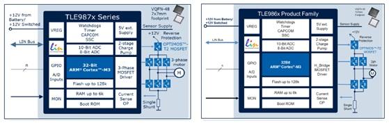 这两个系列产品均提供可灵活扩展的闪存容量和MCU系统时钟频率,可支持各式各样的电机控制算法。TLE987x和TLE986x使用了相同的MCU和外设,可在DC和BLDC电机控制应用之间实现设计协力效应。Infineon该系列的所有器件均实现了引脚兼容和软件兼容。有了这个新的可灵活扩展的EmbeddedPower家族,从低端继电器电机控制,到高端MOSFET电机控制,可以高效而又经济划算地生产出各种电机控制设备。其他特性还包括4K模拟EEPROM、用于诊断功能的8位ADC、SPI、UART、用于为三相电机控制生成PWM信号的定时器、片上晶振和PLL等。所有器件均具备高级保护和诊断功能,如可调漏-源监测。