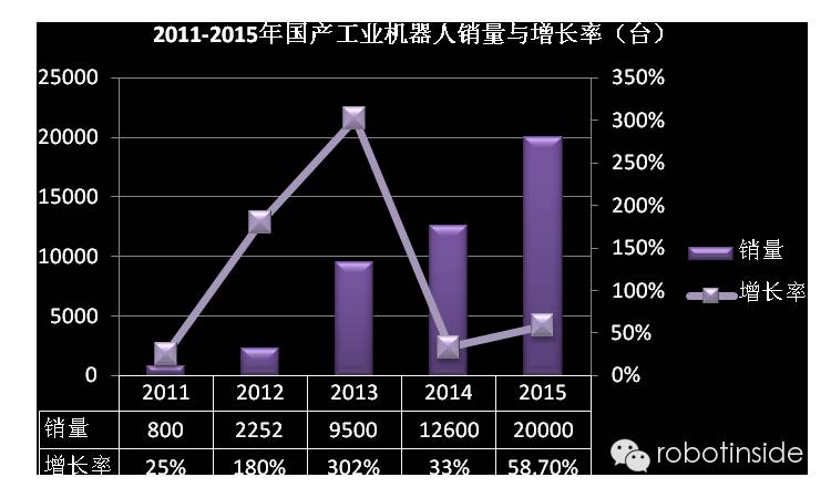 图二:2011-2015年国产工业机器人销量与增长率(台)