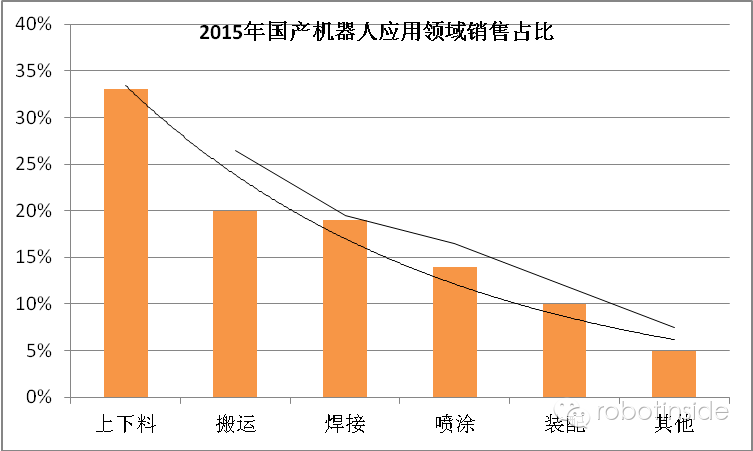 2015年工业机器人除了在汽车行业的广泛应用外,在电子,食品加工,非金属加工,日用消费品和木材家具加工等行业对工业机器人的需求增长较快。随着工业机器人发展的深度和广度以及机器人智能水平的提高,工业机器人已在众多领域得到了应用。从传统的汽车制造领域向非制造领域延伸。如采矿机器人、建筑业机器人以及水电系统用于维护维修的机器人等。在国防军事、医疗卫生、食品加工、生活服务等领域工业机器人的应用也越来越多。