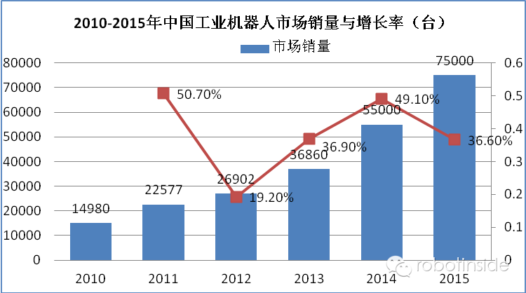图一:2010-2015年中国工业机器人市场销量与增长率(台)